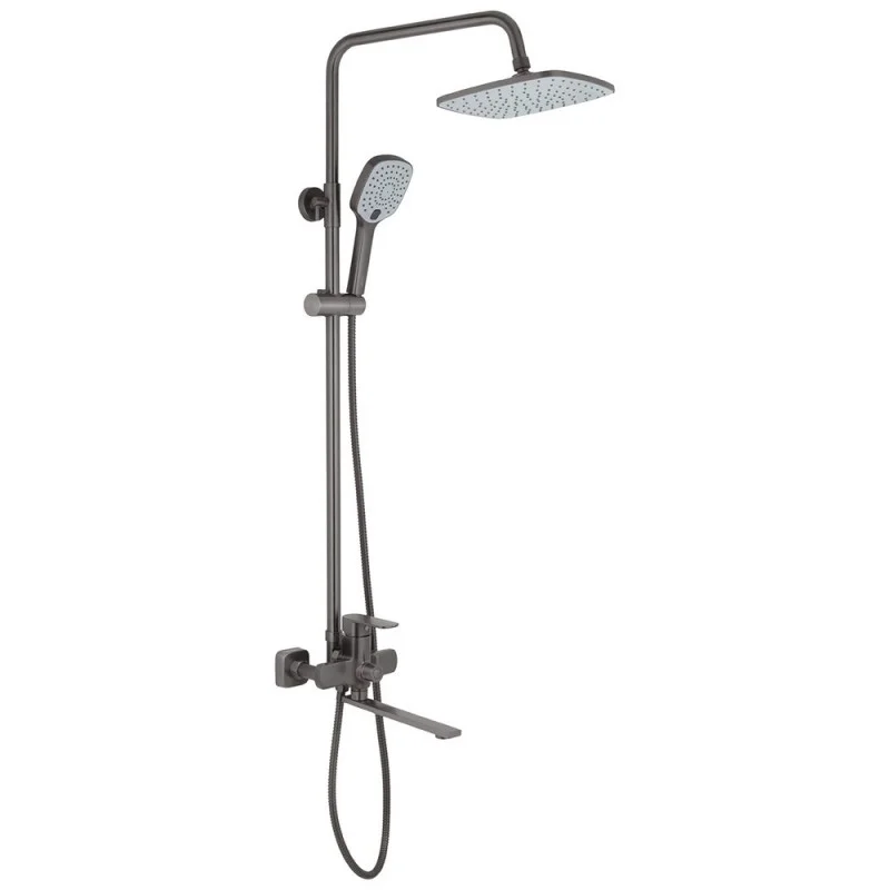 Смеситель, кронштейн для верхнего душа, лейка для верхнего душа, кронштейн для ручного душа, лейка для ручного душа, душевой шланг, душевая стойка, крепежи, фум лента, инструкция.