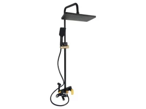 - Система включает верхний душ прямоугольной формы, ручной квадратный душ и компактный гигиенический душ. Все основные элементы – корпус, трубы, гусь, прямой и спиральный шланги – выполнены в черном матовом цвете, а декоративные детали, такие как накладные кольца, держатели, рычаг и гайки, имеют золотое покрытие. Такое сочетание оттенков придает изделию особый шарм и делает его стильным акцентом ванной комнаты.
