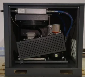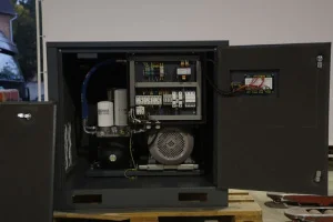Компрессор изготовлен в шумоизолированном корпусе, что делает его значительно тише по сравнению с аналогами, особенно с поршневыми компрессорами. Винтовой компрессор обеспечивает стабильный поток сжатого воздуха, при этом доля смазки на выходе значительно меньше, чем у поршневых компрессоров. Преимуществом также являются более редкие сервисные интервалы для замены смазки и фильтров, а также значительно больший ресурс.