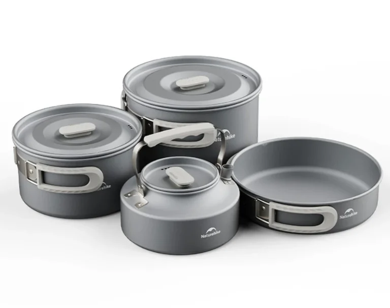Все предметы изготовлены из анодированного алюминиевого сплава марки 3003. Каждая емкость оснащена складными ручками из нержавеющей стали 201. Ручки дополнены термостойкими накладками из бакелита — они не нагреваются и защищают руки от ожогов. Совместимость с газовыми горелками и керамическими плитами, можно использовать на костре
