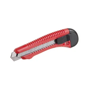 Имеет усиленный стальной направляющей пластмассовый корпус с кнопкой выдвижения и фиксации лезвия.