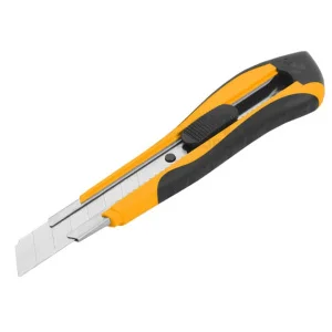 Эргономичный двухкомпонентный корпус из ABS-пластика и термопластиковой резины TPR, плоская кнопка движения и фиксации лезвия и автофиксация лезвия; 3 лезвия из стали SK4