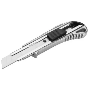 Корпус из алюминиевого сплава, металлическая направляющая, плоская кнопка движения и фиксации лезвия, упаковка: блистер-карта