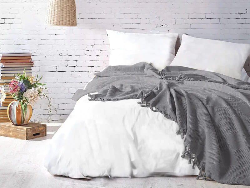 Покрывало "Mona" изготовлено из 100% хлопка, имеет стильный жаккардовый геометрический рисунок, а края украшены бахромой ручной работы.