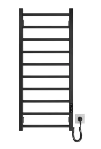 Электрический полотенцесушитель Hygge Family Leeds 970×430×85 мм в чёрном матовом исполнении - это функциональное и стильное решение для современной ванной комнаты. Модель изготовлена из углеродистой стали с антикоррозийной обработкой, что обеспечивает устойчивость к влаге и длительный срок службы даже при постоянной эксплуатации. Конструкция включает 10 горизонтальных ребер из круглой трубы и прочные боковые стойки из квадратного профиля. Увеличенная высота по сравнению с компактными моделями позволяет разместить больше полотенец или текстиля, что особенно удобно для семьи. При этом настенный монтаж помогает сохранить полезное пространство и делает устройство удобным в использовании. Чёрное матовое покрытие придаёт полотенцесушителю современный и аккуратный внешний вид. Такое решение отлично сочетается с минималистичными и контрастными интерьерами, подчёркивая стиль помещения. Вес модели составляет около 4,2 кг, что упрощает установку и транспортировку.