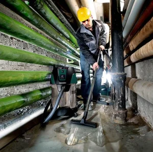 Встроенная розетка предоставляет возможность синхронно работать с электроинструментом. 30 литровый контейнер рассчитан на продолжительную работу, очистка фильтра производится оператором, с помощью специального включателя. Во время влажной уборки при критическом наполнении бака электроника отключает пылесос Metabo ASA 30 L PC INOX. Для передвижения по территории предусмотрены колесики.