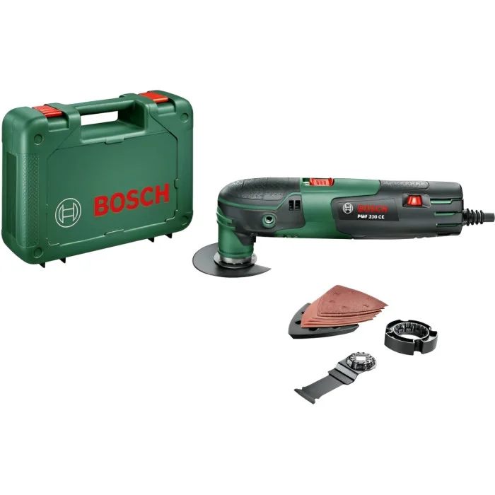 Многофункциональный инструмент Bosch PMF 220 CE; 4-уровневый ограничитель глубины к сегментированному пильному полотну; дельташлифовальная платформа 93 мм, AVZ 93 G; погружное пильное полотно HCS, древесина, 32x40 мм, AIZ 32 EPC; ключ торцевой шестигранный; комплект детальшлифовальных полотен; сегментированное пильное полотно BIM Wood and Metal, 85 мм, ACZ 85 EB; кейс