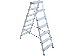 Прочные шарниры и стяжки фиксируют секции стремянки, исключая риск самопроизвольного складывания. Двухсторонняя конструкция позволяет подниматься с любой стороны, что делает использование максимально универсальным и удобным.