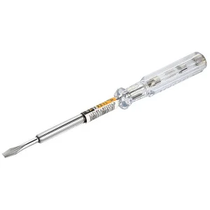 Тестер Tolsen 38014 имеет простую и надёжную конструкцию длиной 140 мм. Он состоит из металлического стержня и изолированной рукоятки, обеспечивающей безопасность при работе с электричеством. На конце стержня расположено прямоугольное жало длиной 3 мм с насечками, которое обеспечивает стабильный контакт при измерении.