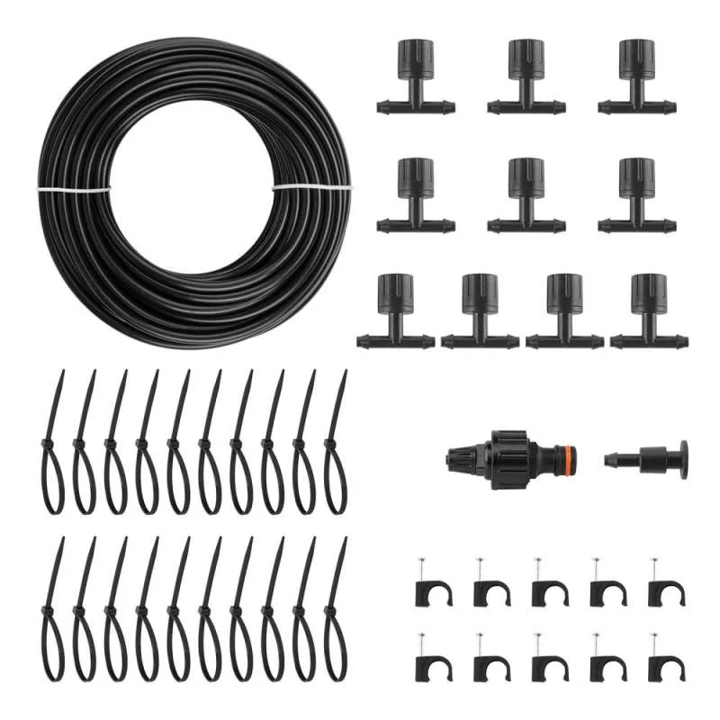 10м шланг, адаптер для быстрого соединения с фильтром, 10-кратная распылительная насадка, 1-кратная заглушка для окончания шланга, 10-кратный держатель шланга, фиксирующая лента для шланга