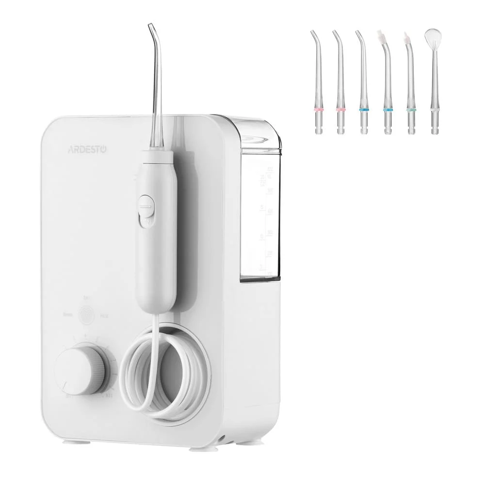 - В комплект входят различные насадки: четыре классические, насадка для чистки языка, насадка для удаления налёта и пародонтологическая насадка. Такой набор делает Ardesto OI-T600W настоящим зубным центром, способным удовлетворить потребности каждого члена семьи.