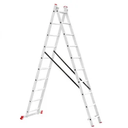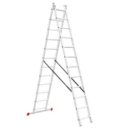 приставной лестницы. Делают их из алюминия со стальными вставками в местах фиксации положений. Если вы затеяли масштабный ремонт на даче или у вас есть сад – рекомендуем купить двухсекционную лестницу. Она поможет вам добраться до кровли или даже до подоконника второго этажа, а в саду поможет в расчистке веток и в сборе плодов. Цена складной двухсторонней лестницы конечно выше чем односекционной, но возможности применения значительно шире.