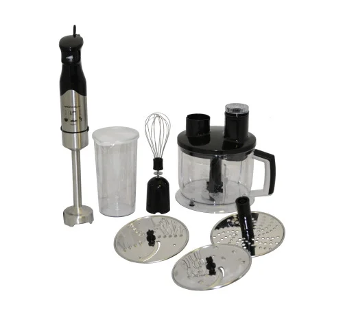 Блендер, Гострі чотирипелюсткові ножі, Чаша з подрібнювачем, Мірний стакан 0.6 л, Віночок з нержавіючої сталі, Три диски для грубої та дрібної нарізки та подрібнення овочів та фруктів, Товкач.