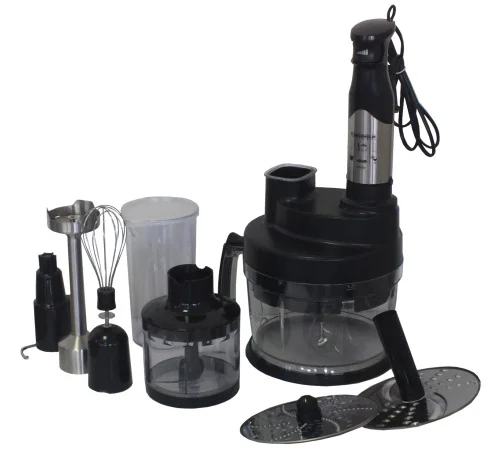 Блендер, гострі чотирипелюсткові ножі, чаша з подрібнювачем, мірна склянка 0.6 л, Віночок з нержавіючої сталі, два диски для грубої та дрібної нарізки та подрібнення овочів та фруктів, насадка для нарізування кубиками, гак для замісу тіста, штовхач.