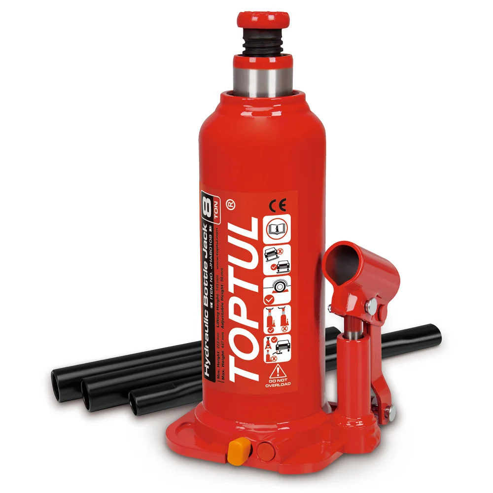 Гідравлічний пляшковий домкрат Toptul JHAB0108 із вантажопідйомністю 8 тонн - це високовисокоякісний та надійний інструмент, призначений для безпечного підйому легкових автомобілів та іншої техніки під час ремонту та технічного обслуговування. Його конструкція забезпечує стійкість, компактність і легкість у використанні, що робить домкрат незамінним в автосервісах, гаражах і на дорогах. Діапазон висоти підйому становить від 222 до 447 мм, а робочий хід поршня — 145 мм, що дозволяє легко працювати з автомобілями з різним кліренсом. Домкрат оснащений одним гідравлічним поршнем та різьбовим штоком 80 мм, який додатково регулює висоту підйому для максимально точного позиціювання. З вагою всього 4,8 кг пристрій легко переносити та зберігати навіть у обмеженому просторі. Корпус домкрата виготовлений із міцної сталі та підсилений зварюванням із основою, що підвищує його надійність і знижує ризик витоку оливи. Основна платформа виготовлена з високоякісного чавуну, забезпечуючи довговічність і стійкість під час роботи з важкими автомобілями.