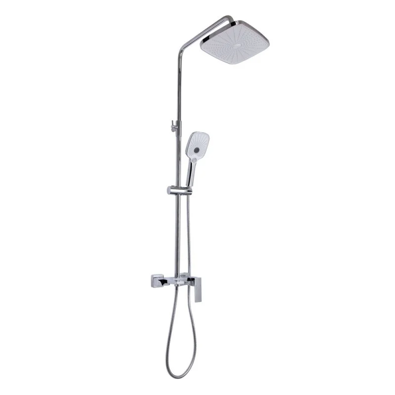Змішувач, душова стійка, лійка для ручного душу, душовий шланг, кронштейн, деталі кріплення.