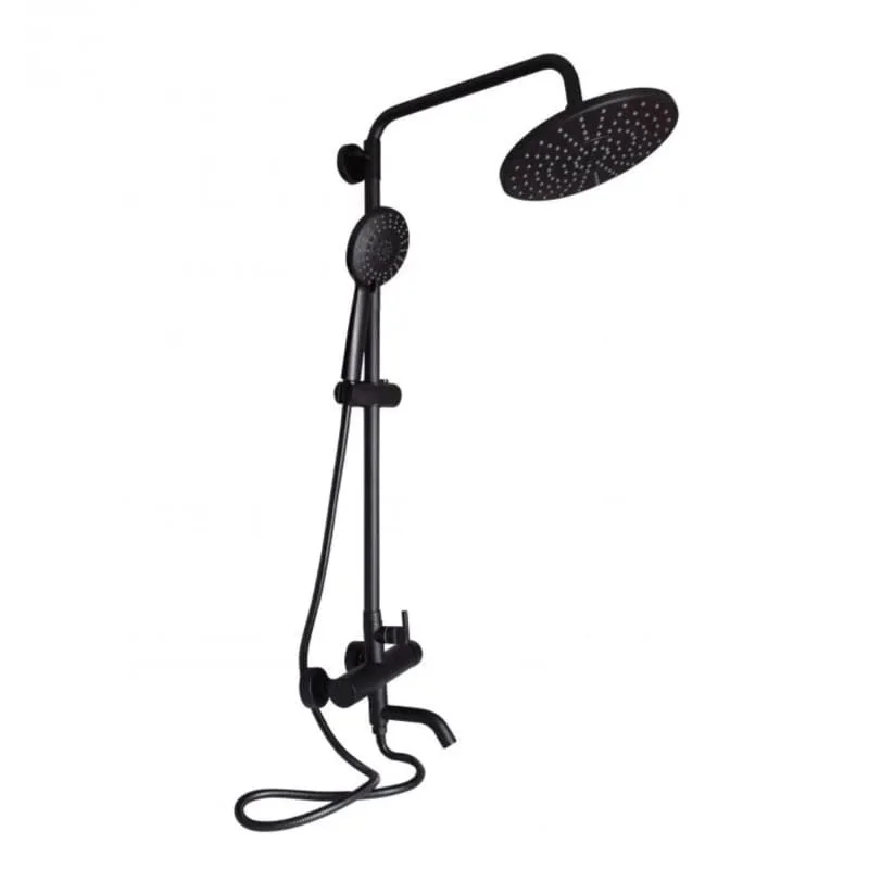 Комплектація включає всі необхідні елементи: змішувач, кронштейни для верхнього та ручного душу, воронки, душовий шланг, стійку та кріплення. Це робить установку максимально зручною та швидкою.