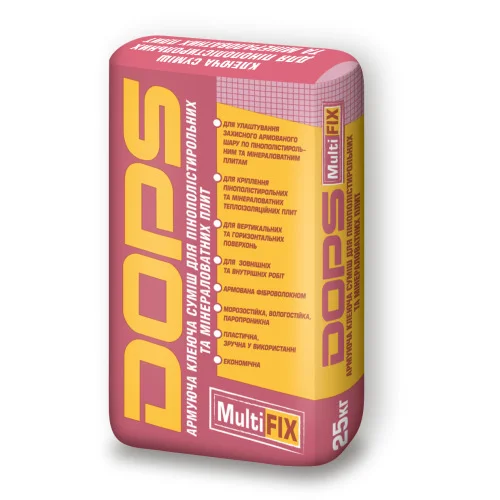 Особливості клею армуючого для пінополістирольних та мінераловатних плит Dops MultiFix Optima 25кг