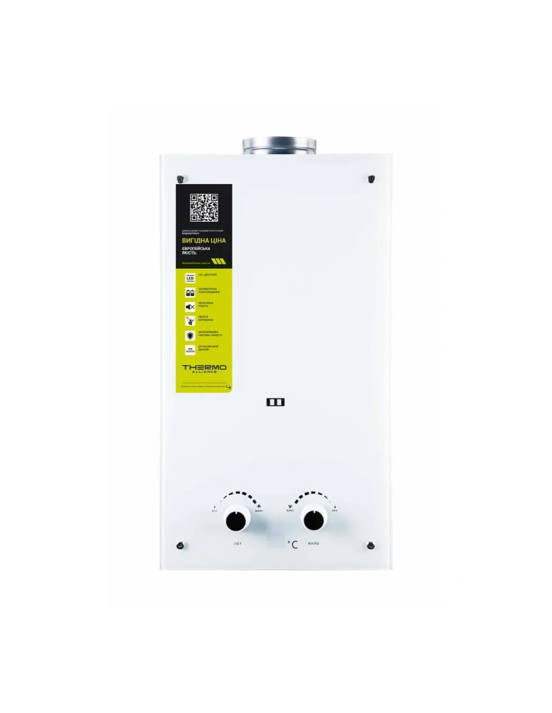 Thermo Alliance JSD20-10GE оснащена базовими, але необхідними системами захисту, що забезпечують безпечну експлуатацію. У конструкції передбачений контроль наявності полум’я, захист від перегріву теплообмінника, а також стабільна робота при коливаннях тиску води та газу. Камера згоряння атмосферного типу забезпечує надійне відведення продуктів згоряння через димохід. Керування колонкою механічне, інтуїтивно зрозуміле та не потребує складних налаштувань. Користувач може легко регулювати температуру води, орієнтуючись на власні потреби. Відсутність складної електроніки підвищує надійність пристрою та знижує ризик відмов під час тривалої експлуатації. Теплообмінник виконаний із якісних матеріалів, стійких до високих температур і корозії, що позитивно позначається на терміні служби обладнання. Колонка відповідає класу захисту IPX5D, що гарантує додаткову стійкість до вологи. Газова колонка Thermo Alliance JSD20-10GE - це практичне та економічне рішення для тих, хто шукає простий, ефективний і надійний водонагрівач з хорошою продуктивністю та перевіреною конструкцією для щоденного використання.