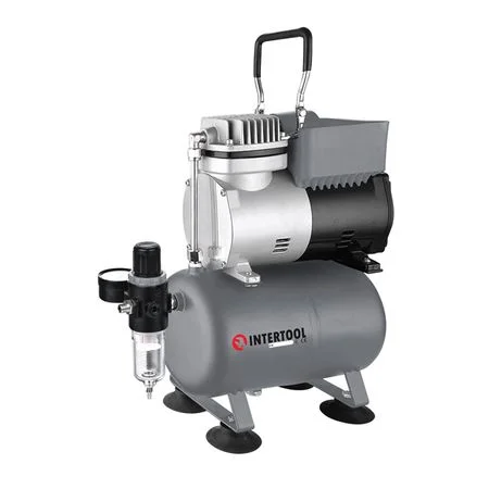 У цьому агрегаті використовується безмасляний компресор із прямим приводом. Безмасляна конструкція дозволяє отримати стиснене повітря вищої якості, що дозволяє використовувати його в медицині та харчовій промисловості. Нормальна робота компресора забезпечується співвідношенням часу роботи та відпочинку як 2:1. Для згладжування пульсацій та стабілізації подачі повітря компресор INTERTOOL PT-0001 обладнаний ресивером (накопичувачем) об'ємом 3л, розташованим горизонтально. У нижній частині ресивера розташований клапан для зливу конденсату. Продуктивність компресора становить 45л/хв на вході при максимальному тиску 3.2 бар (0.32Мпа). Блок автоматики відключає компресор при досягненні тиску повітря в ресивері 3.2 бар і знову включає його при зниженні тиску повітря в ресивері до 2бар. Аварійний клапан скидання не дозволяє збільшити тиск у ресивері понад 3.5 бар. Контролювати роботу та регулювати тиск дозволяють манометр та надійний блок автоматики (Прессостат). Для отримання повітря необхідної якості компресор обладнано блоком очищення повітря. Також до безперечних переваг компресора INTERTOOL PT-0001 можна віднести малу вагу, ручку для транспортування, економічний двигун і формат швидкознімних штуцерів. Опорні ніжки компресора виготовлені з гуми, що значно зменшує вібрацію та запобігає мимовільному переміщенню по опорній поверхні. Український виробник "Інтертул" надає гарантію 1 рік на своє обладнання.