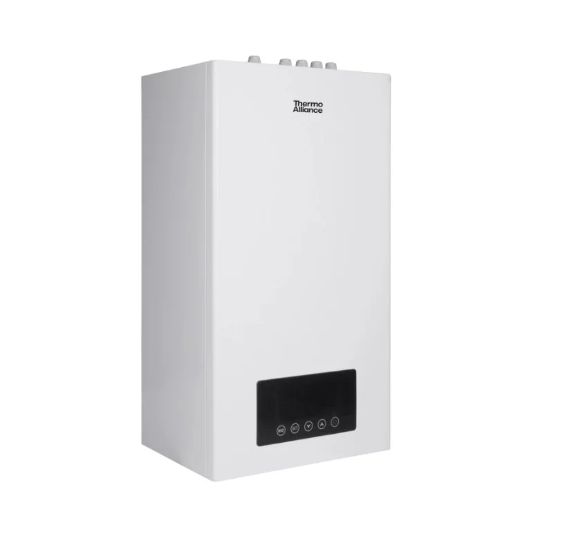 Електричний котел Thermo Alliance потужністю 12 кВт - це продуктивне та сучасне рішення для опалення житлових будинків, котеджів і комерційних приміщень. Модель призначена для роботи в закритих системах опалення з максимальним надлишковим тиском до 3 бар. Настінний формат встановлення дозволяє економити простір і спрощує монтаж, роблячи пристрій зручним для розміщення в технічних приміщеннях. Котел працює від трифазної мережі 380 В, що забезпечує стабільну роботу навіть при високих навантаженнях. В основі конструкції лежить теплообмінник із нержавіючої сталі та алюмінієвого сплаву з інтегрованими нагрівальними елементами. Таке поєднання матеріалів забезпечує ефективну теплопередачу, стійкість до корозії та довговічність експлуатації. Котел оснащений вбудованим циркуляційним насосом і розширювальним баком об’ємом 6 літрів, що значно спрощує створення повноцінної системи опалення без необхідності встановлення додаткового обладнання. Температура теплоносія регулюється в діапазоні від 25 до 80 °C, дозволяючи точно налаштувати комфортний мікроклімат. Керування здійснюється за допомогою електронного блока з LED-дисплеєм, на якому відображаються основні параметри роботи. Додатково передбачена можливість підключення бойлера непрямого нагріву при використанні комплекту Thermo Alliance AquaKit (придбавається окремо), що розширює функціональні можливості системи.