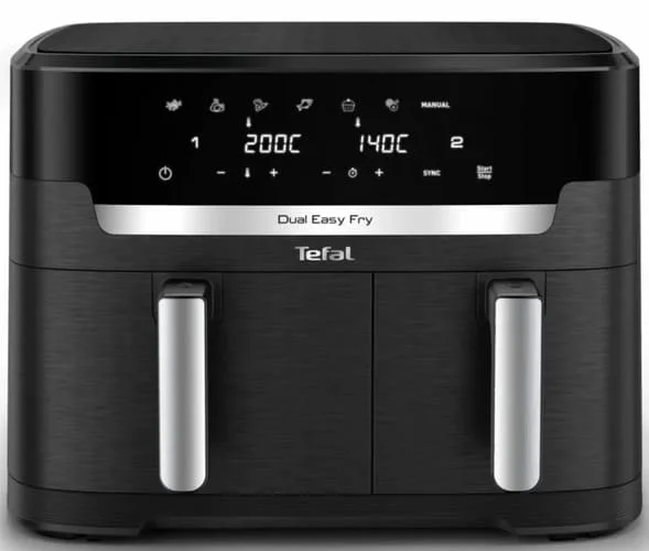 Завдяки двом асиметричним чашам загальним об'ємом 11 літрів, ви можете готувати дві різні страви одночасно. Велика чаша об'ємом 6,5 літра ідеально підійде для приготування великих порцій для всієї родини, а чаша об'ємом 4,5 літра – для приготування однієї порції. Функція синхронізації приготування в обох чашах дозволить вам максимально ефективно використовувати час. Технологія Extra Crisp оптимізує потоки повітря, забезпечуючи ідеальне приготування страв. Зовні вони виходять хрусткими і золотистими, а всередині – м'якими і соковитими. Насолоджуйтесь улюбленими стравами з маслом на 99% менше, ніж при звичайному смаженні! Dual Easy Fry&Grill споживає на 70% менше енергії і готується на 40% швидше, ніж традиційні духовки. Це не тільки економить ваші гроші, але і дозволяє швидше насолоджуватися смачними стравами. Знімні частини мультипечі можна мити в посудомийній машині, що значно спрощує процес прибирання після приготування. Відкрийте для себе світ кулінарних ідей з безкоштовним додатком Tefal, який пропонує широкий вибір щоденних рецептів, що готуються менше ніж за 15 хвилин.