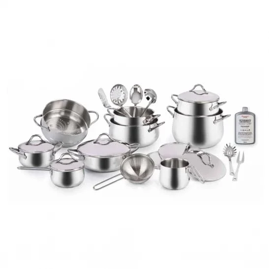 Набір посуду з нержавіючої сталі, створений для тих, хто цінує бездоганну якість, сучасний дизайн та функціональність. Цей набір посуду відрізняється мінімальним та сучасним дизайном, який гармонійно впишеться в будь-який інтер'єр. Його елегантність дозволяє використовувати посуд не тільки для приготування їжі, але й для ефектного сервірування столу, створюючи атмосферу затишку та вишуканості.