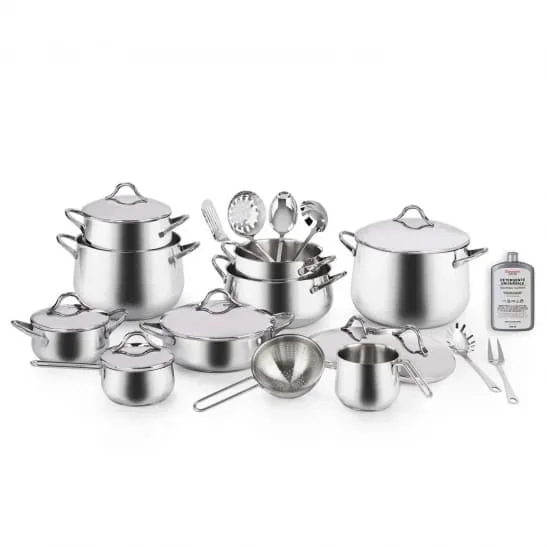Висока каструля 5 л (20 см) Висока каструля 8 л (24 см) Каструля 1,4 л (16 см) Каструля 3 л (20 см) Каструля 5 л (24 см) Низька каструля 2,7 л (24 см) Ківш 0,8 Дуршлаг (14 см) Ківш для молока 1,5 л (12 см) Кришки 14 см, 16 см, 20 см (2 шт.), 24 см (3 шт.) Набір кухонного приладдя (лопатка, шумівка, ложка, половник, ложка для спагетті, вилка для м'яса) Універсальний очисник.