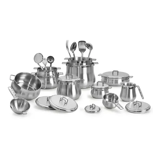 Каструля ø см 18 - Каструля ø см 22 - Каструля ø см 26 - Каструля ø см 14 - Каструля ø см 18 - Каструля ø см 22 - Низька каструля ø см 26 - Каструля ø см 12 - Кошик для пароварки ø см 22 - Друшляк ø см 14 - Горщик для молока ø см 12 - Кришки ø см 12/14/18 (x2)/22 (x2)/26 - Набір кухонних інструментів із 7 предметів