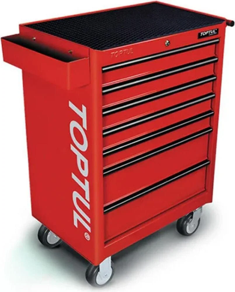 Візок пофарбований у фірмовий стиль бренду Toptul, що надає йому сучасного та професійного вигляду. Вона не тільки функціональна, а й естетична, що особливо важливо для майстерень та сервісних центрів, де цінується порядок та презентабельність робочого місця.
