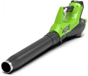 перед іншими моделями з бензиновим джерелом харчування, є відсутність шкідливих викидів в атмосферу. Машина відрізняється легкою вагою і малошумною роботою. У повітродувки акумуляторної Greenworks G40ABK2 з АКБ 2Ah і ЗП (2400807UA) є спеціальний перемикач для плавного регулювання швидкості потоку повітря. Курок регулювального коліщатка фіксується в заданому положенні для безперервної стабільної роботи.